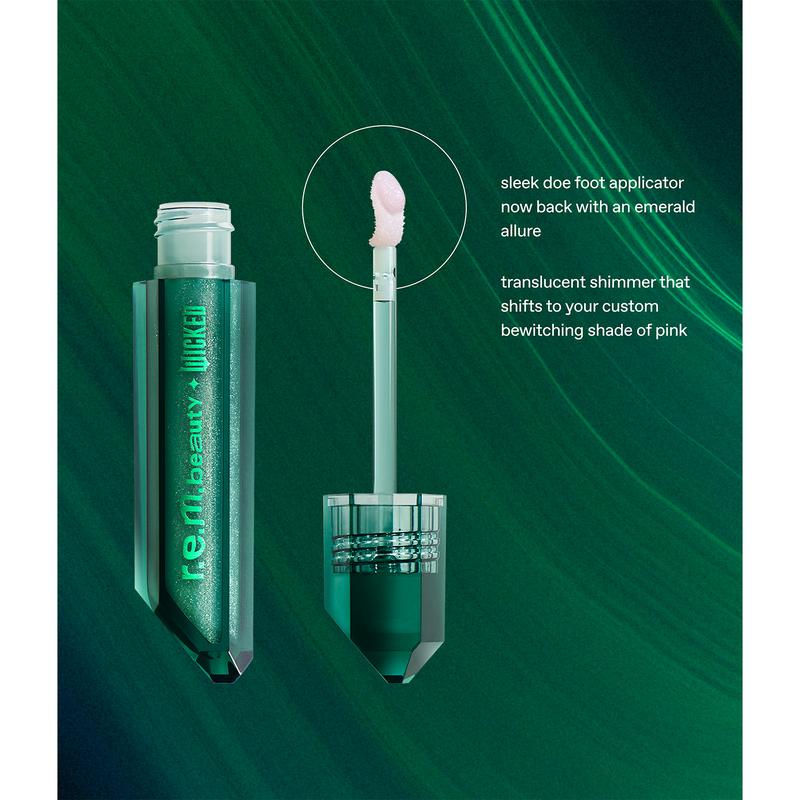 our r.e.m. beauty x Wicked: For Good pH adaptive lip oil applies iridescent bubble-inspired shine and magically evolves to each wearer for a custom, buildable shade of warm, oh so popular pink.